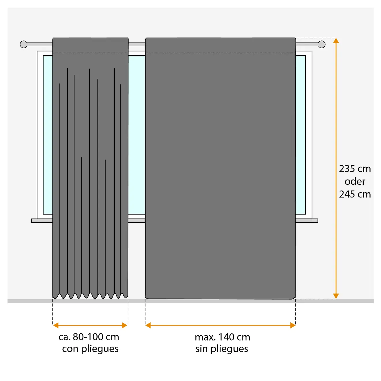 La cortina es completamente opaca y ofrece una protección visual total cuando está cerrada. Gracias a la cinta fruncida, también puede brillar de manera decorativa en la barra o riel de la cortina. Su propiedad de absorción de sonido hace que las cortinas con cinta fruncida sean ideales para dormitorios o habitaciones infantiles. No solo amortiguan el sonido del exterior, sino también del interior, proporcionando así una acústica agradable en la casa. Gracias a la capa intermedia cosida, oscurecen entre un 95-98%, permitiendo un sueño reparador sin interrupciones por la entrada de luz.