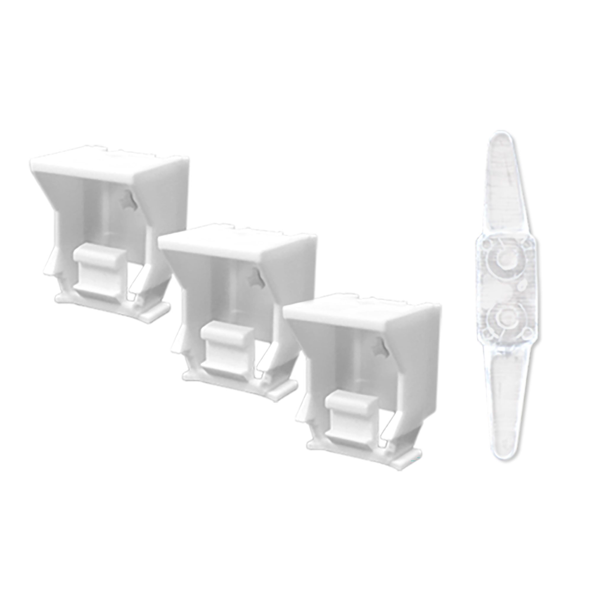 Para el montaje en el marco de la ventana o en la hoja de la puerta, puedes prescindir completamente de taladrar – simplemente selecciona la versión de pinza en el menú de opciones. Pero asegúrate de que el grosor del marco no exceda los 25 mm. Especialmente para ventanas y puertas de plástico, la fijación con pinzas es perfecta. Y así es como funciona: Simplemente fija el soporte estándar al soporte de pinza. Luego engancha el soporte con un poco de presión en el riel y coloca el soporte de pinza en el marco. Ahora fija los soportes en el marco. Finalmente, coloca las tapas de cobertura.