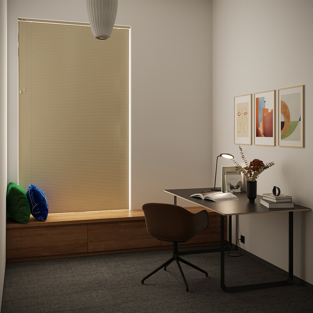 El sistema se basa en lamas perforadas desplazadas, que eliminan las habituales grietas de luz visibles alrededor de los cordones de las escalerillas. El resultado es una ocultación homogénea y máxima, transformando cualquier espacio en un cómodo refugio para concentrarse o relajarse.