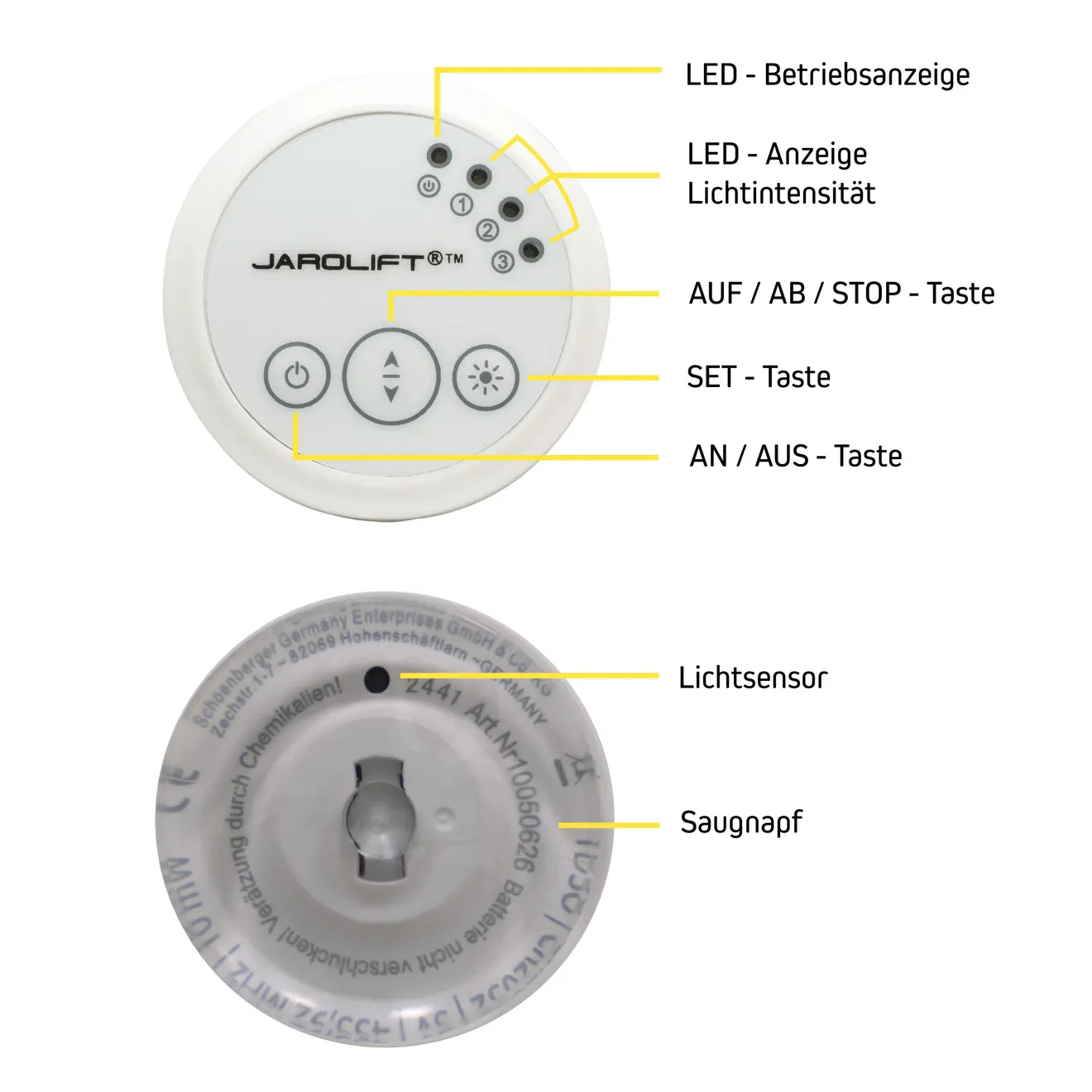 El sensor solar inalámbrico TDSO de fácil uso de JAROLIFT®™ controla todas las persianas dentro del alcance inalámbrico con la ayuda del sensor de luz integrado. A diferencia de los temporizadores convencionales, el sensor solar inalámbrico reacciona después de unos minutos a las condiciones de luz ya programadas o recién aprendidas y, por lo tanto, no está vinculado a horarios específicos.